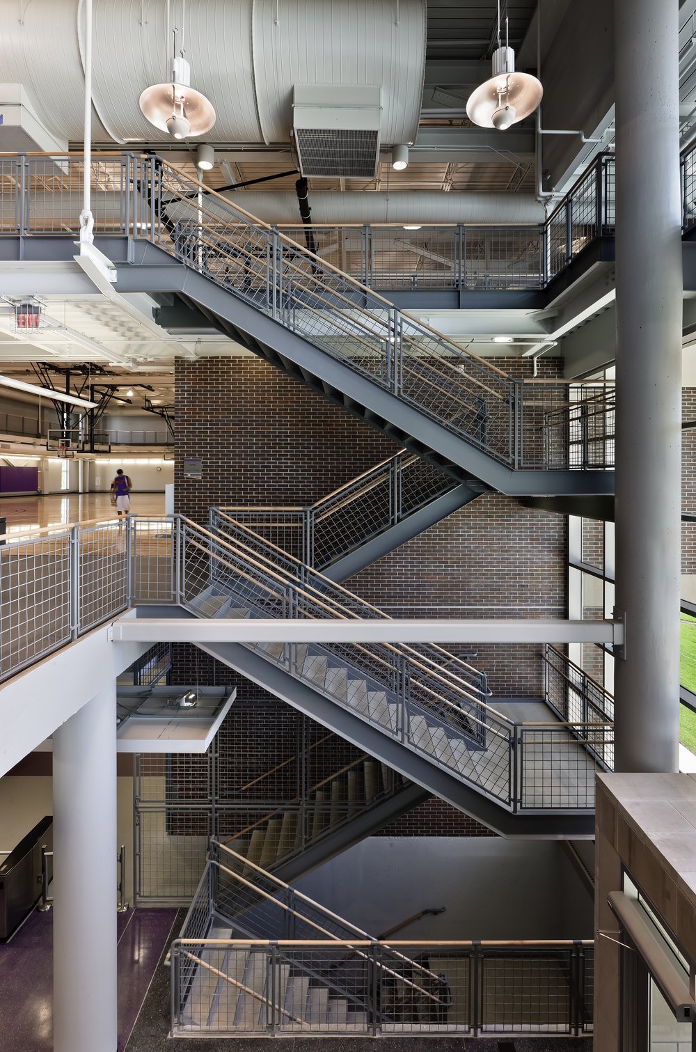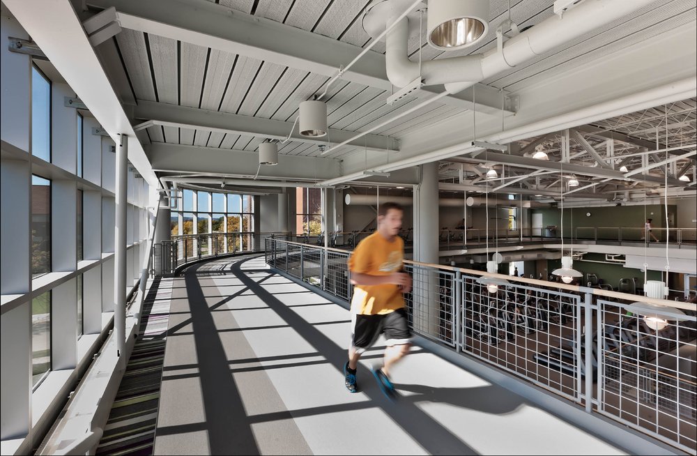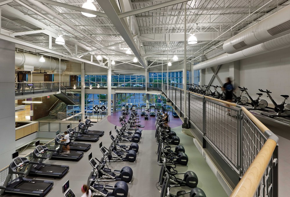 The building combines elements typically found within an athletic facility such as an indoor fitness track, cardiovascular fitness and strength-training facilities, gymnasiums, and aerobics classrooms, with those typically found in a health services building such as a health services clinic, a counseling center, and a health education and resource center.