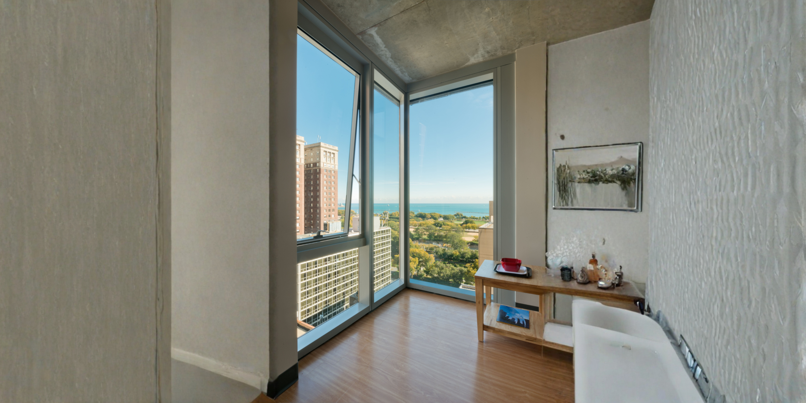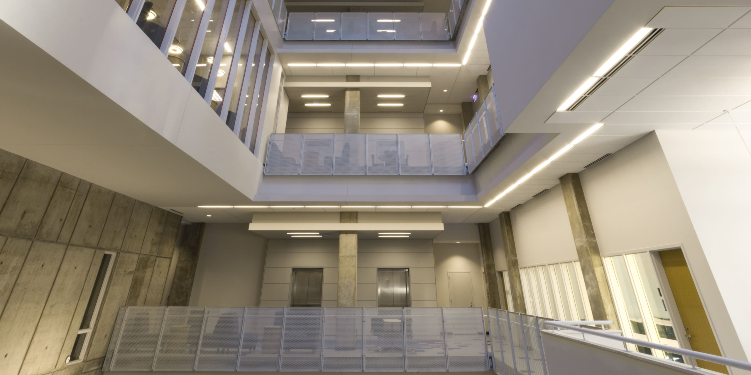 East-West University’s Student Life Center is located in Chicago’s South Loop neighborhood. Because of the land constraints of the urban site, the design team synthesized the traditional university experience into a tower with a vertical quadrangle at its center. The 17-story tower is organized into two major parts – the “base” and the student housing above. The base blends educational and student life spaces arranged around a 100-foot tall atrium – the vertical quad. The first floor includes the commons containing a student café, bookstore, and food services. Within the upper floors are classrooms, faculty offices, a gymnasium and wellness center, and the library. Above the base are apartment-style dorm suites, all with clear views to the lake and city.